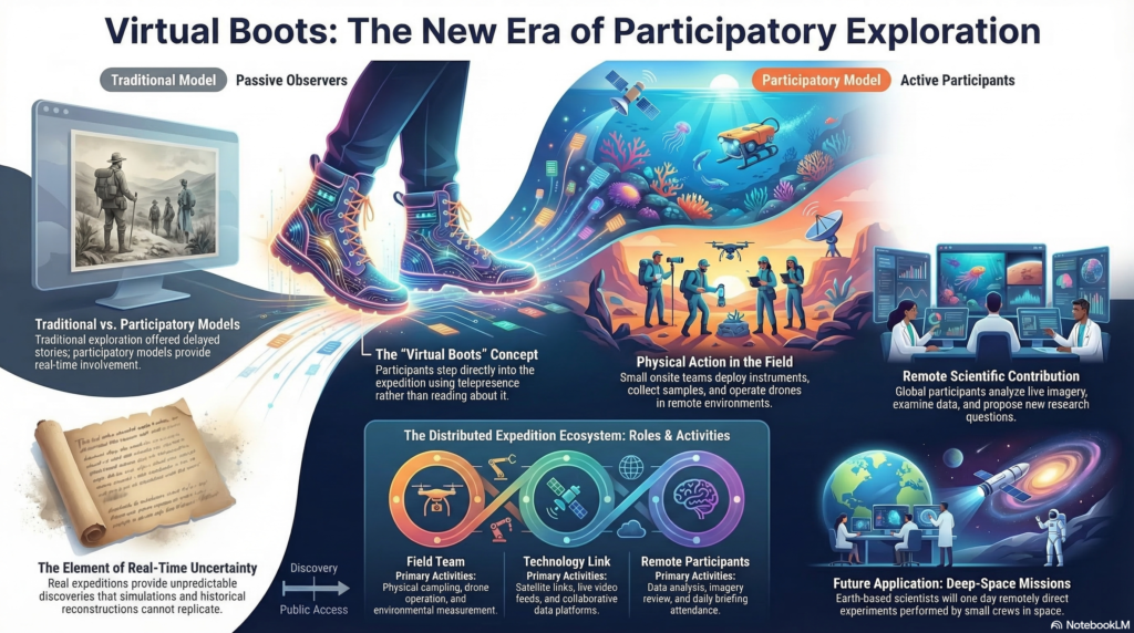 Modern technology has transformed exploration from a passive viewing experience into a collaborative, real-time journey known as a participatory expedition. By utilizing telepresence, remote sensors, and live data, these missions allow students and researchers to “put on virtual boots” and engage with field teams as discoveries actually happen. Unlike traditional documentaries that share findings after the fact, this model emphasizes the unpredictability and uncertainty of true discovery, inviting a global community to analyze data and solve problems alongside those on-site. Ultimately, these distributed research environments serve as a template for future space travel, proving that the spirit of exploration is no longer limited to the few who can physically travel to remote frontiers.