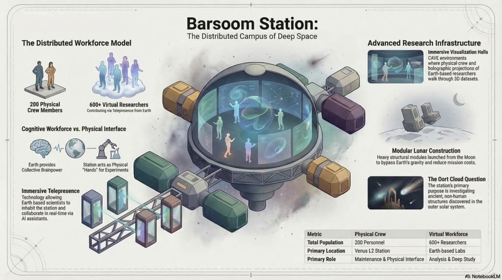 In the fictional account of Kelly Stark and her family that builds in the pages of Solar Empire 2100+  Barsoom Station is a visionary deep-space research outpost situated at the Venus L2 Lagrange point between 2069 and 2090. Unlike traditional military sci-fi settings, this installation operates as a distributed academic campusmodeled after Antarctica’s McMurdo Station, prioritizing intellectual collaboration over command hierarchies. The station’s revolutionary operational model supports a small physical crew of 200 supplemented by over 600 virtual researchers from Earth using advanced telepresence technology. Physical and digital minds interact within immersive visualization halls, which use sophisticated display sheets to allow scientists to literally walk through complex data. Constructed incrementally using lunar-launched modules, the station serves as a specialized observatory dedicated to investigating ancient structures discovered in the Oort Cloud. Ultimately, the text presents a technologically grounded vision of future space exploration defined by modular engineering and a global, collective pursuit of scientific truth.